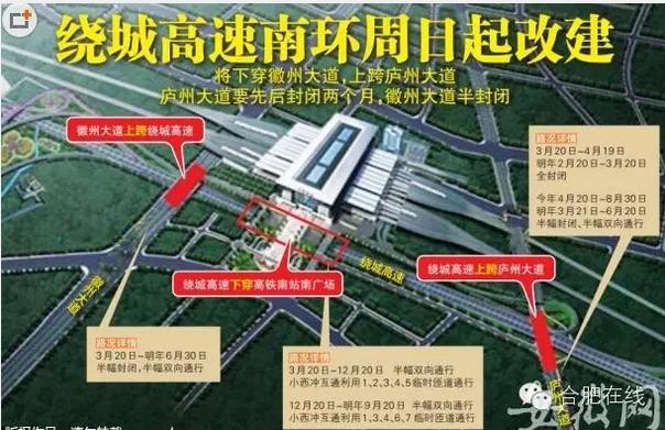 因合肥绕城高速改建工程施工需要,自3月20日00时至2017年9月20日24时,庐州大道、徽州大道、合肥南环高速公路部分路段将封闭或半封闭,合肥交警提醒过往车辆,施工期间注意绕行。